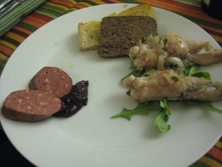 Appetizer 1: frog legs on a bed of Arugula (yep, Host butchered himself), venison pate on toasted bread, and venison sausage with cherry-cranberry mustard. Did I mention the venison was from a deer Host hunted himself? Impressive. Check out the photo up top. OK, I sheepishly admit I was a tad squeamish about trying frogs legs (first time for everything eh?) but they seriously do taste like chicken.