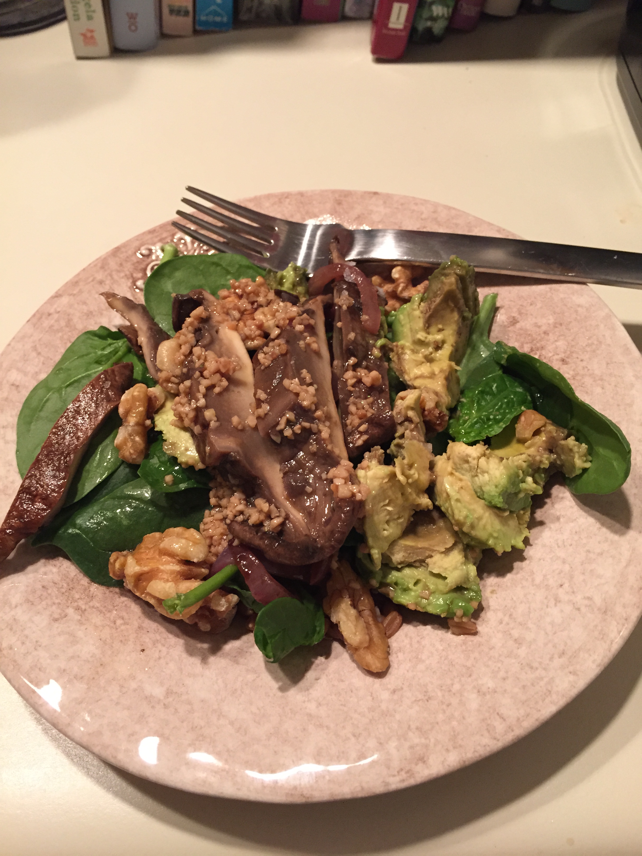 SaladAh, no worries, everyone.  Don’t get overwhelmed or weirded out by that long salad recipe title!  It’s PACKED with yummy goodness and if you’re the slightest bit skeptical about vegan recipes or wondering whether a salad can truly be a meal in itself…well, give this one a whirl and you’ll be convinced!  The mushrooms pack a good dose of protein, and the avocado provides healthy fats we all need (as do the walnuts).  Add in some buttery pears, dark leafy greens (I prefer to serve this over a bed of spinach leaves) and a vinaigrette so easy to prepare and you’ve got a fabulous meal (or two, if you’re cooking for one as I typically do!).  The mushroom and onion will keep in the marinade in a Tupperware in the fridge for a couple days.