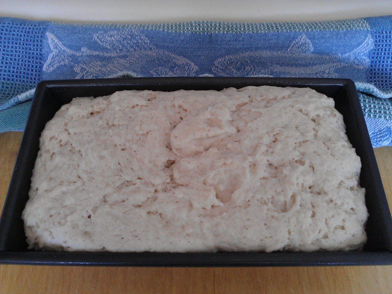 Grease a 9 x 5″ loaf pan. Heat the milk, sugar, salt and butter in a small saucepan over medium heat until warmed and the butter is fully melted. If the milk heats too quickly before the butter fully melts, remove the saucepan from the heat and finish melting the butter. Mix the GF flour, xanthan gum and yeast in a large bowl. Add the warm milk mixture, stirring to combine. The dough will be very sticky. Spread the dough in the prepared loaf pan. Cover and let rise in a warm location free from drafts for 30-60 minutes or until doubled in size.