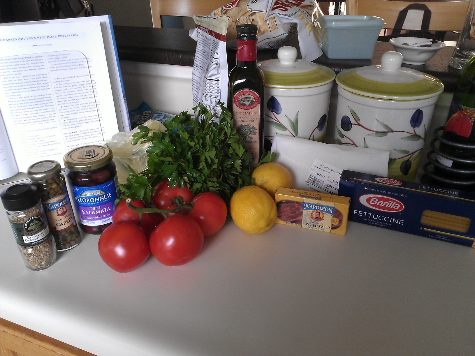 My first reaction was “HUH?” when I spotted this recipe.  I adore ahi tuna as a happy hour appetizer with a nice blob of wasabi on the side, and the pungent puttanesca sauce ingredients are a nice change from plain old pasta and pesto.  But combined together??  Seemed a little strange.  But then again…this recipe is from a Tom Douglas cookbook.  So I knew it would turn out great.